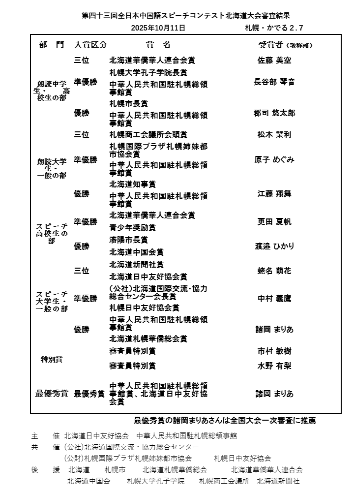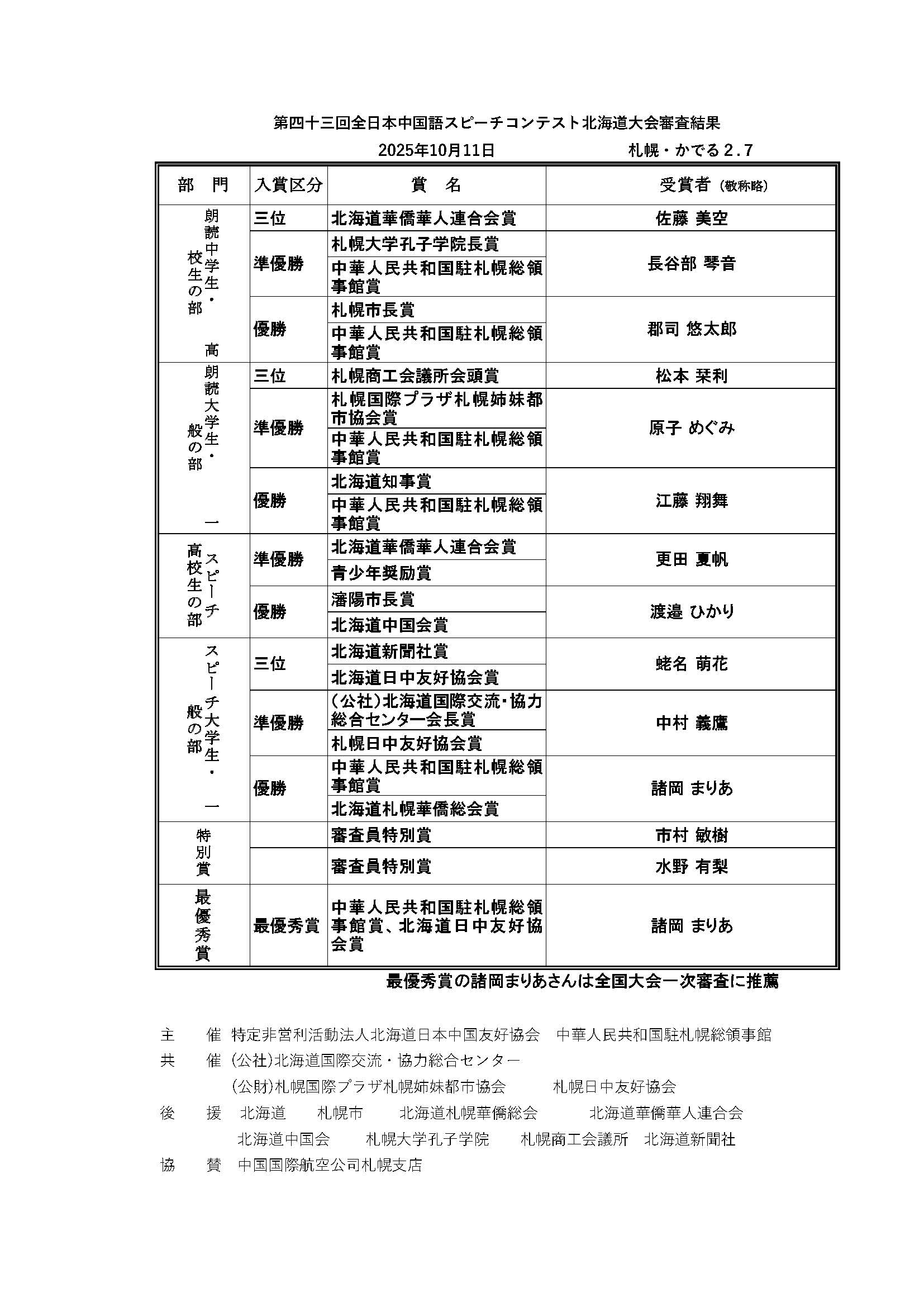 第43回全日本中国語スピーチコンテスト北海道大会の結果は以下の通りです。
